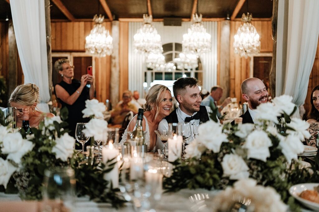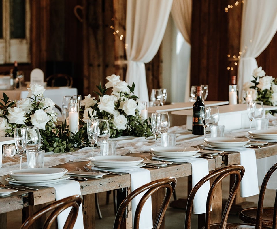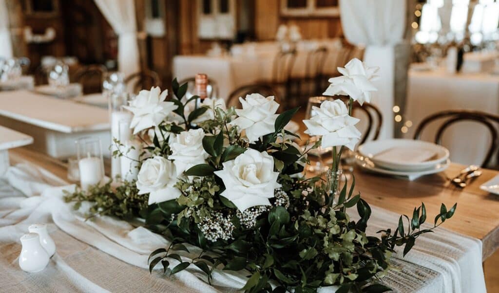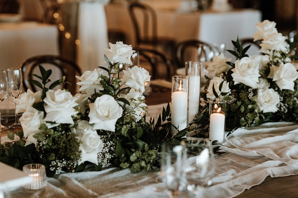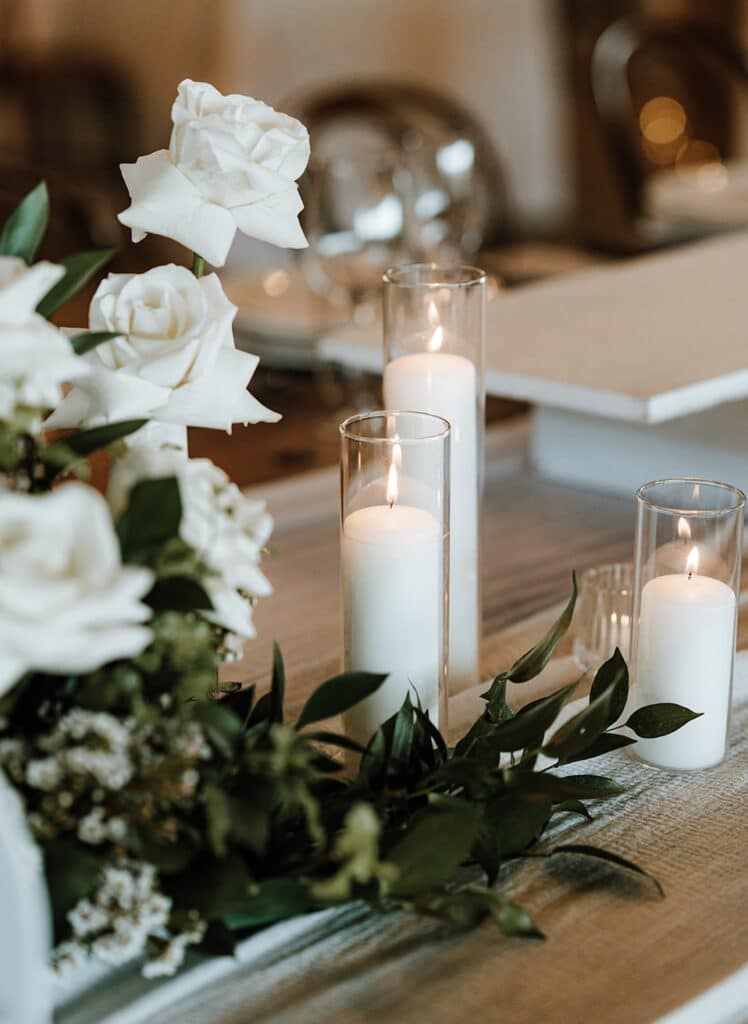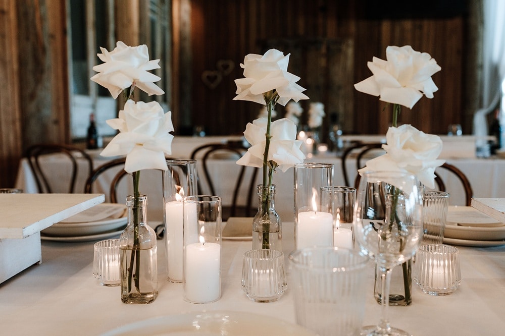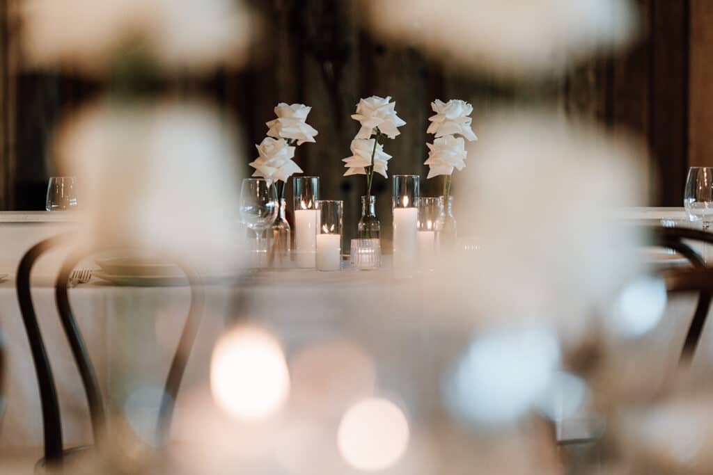 - Guest table flower arrangements of white roses in glass bud vases, pillar and votive candles in glass holders, styled between the venue’s share platter boards.