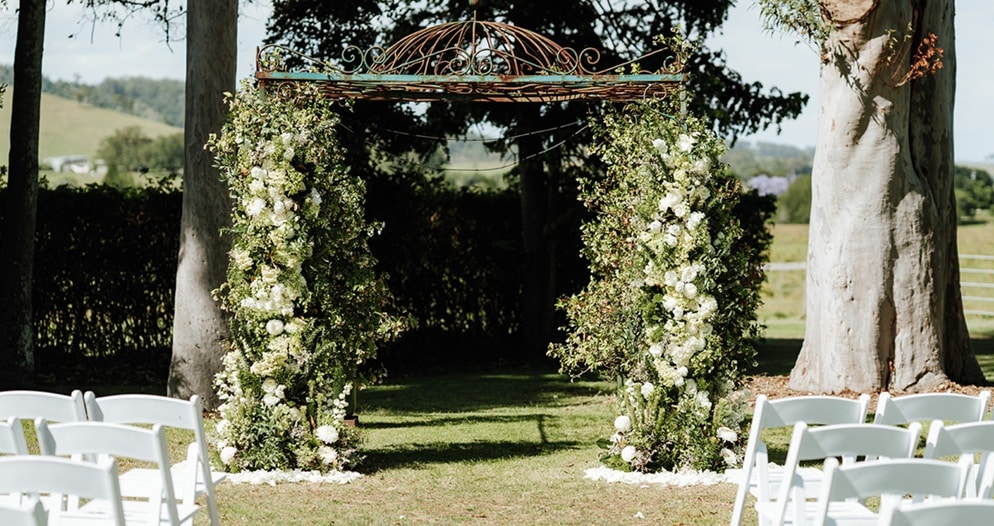 - Ceremony backdrop floral pillar arrangements, styled by the venue’s arbour.