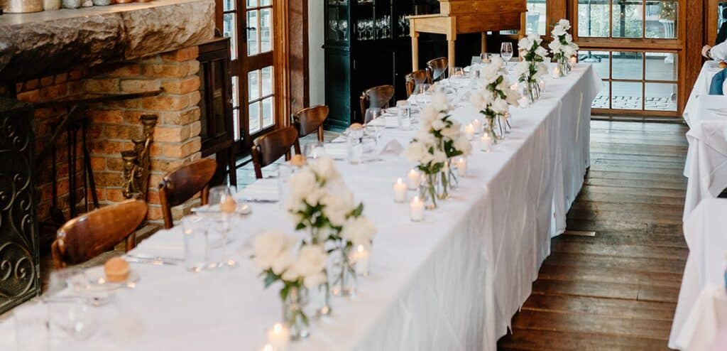 - Bridal and guest tables, glass bud vases with arrangements of white roses.