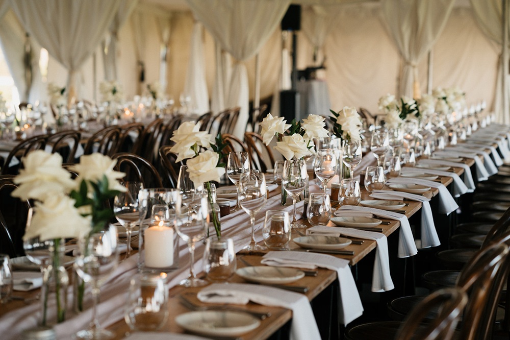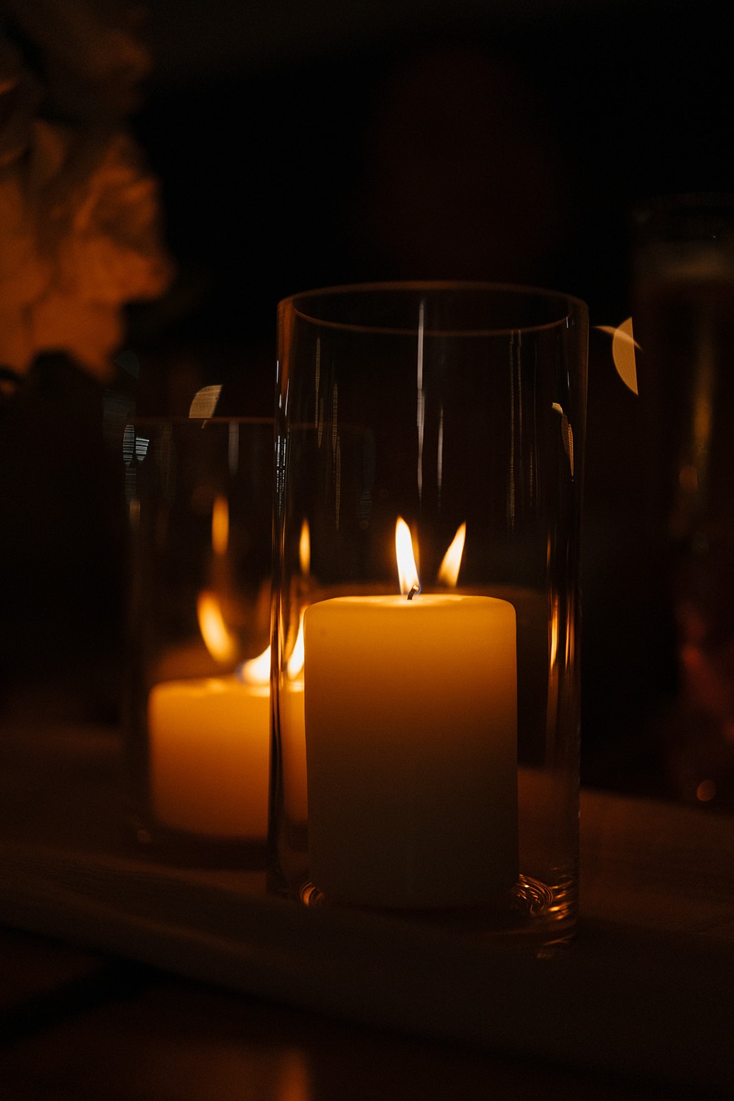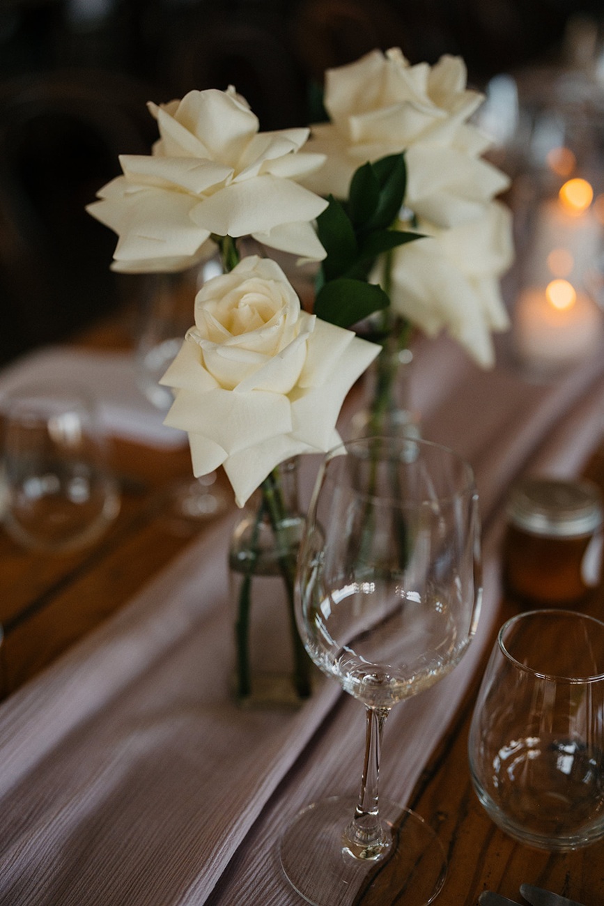 - Reception table arrangements of white roses styled in grouped bud vases with pillar candles in glass holders.