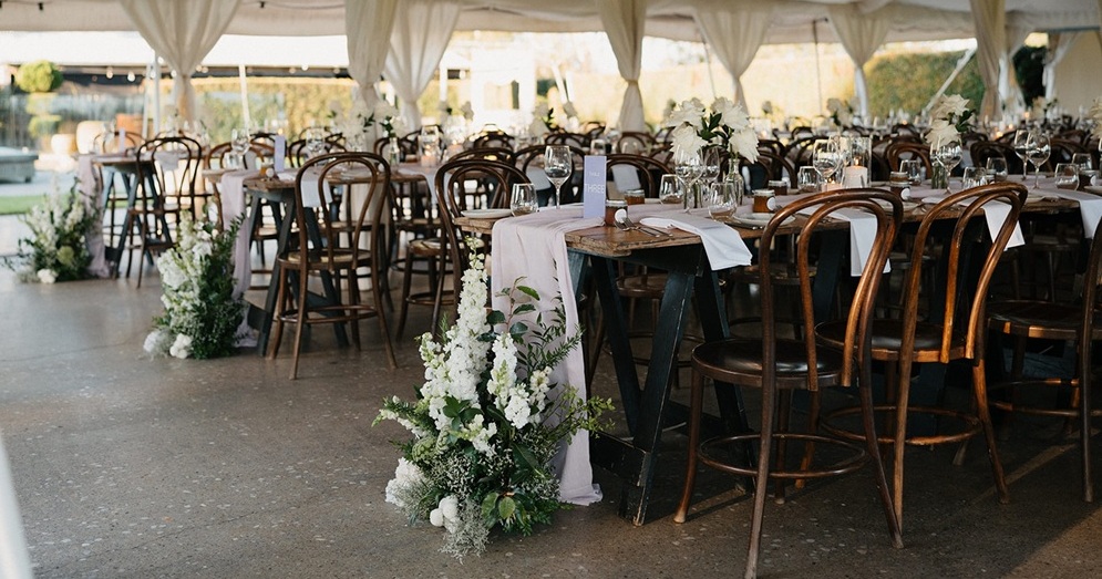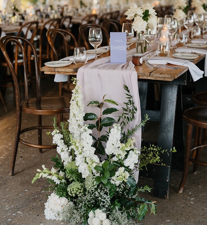 Made with in season flowers, greenery foliage, signage, stationery and styling decor.