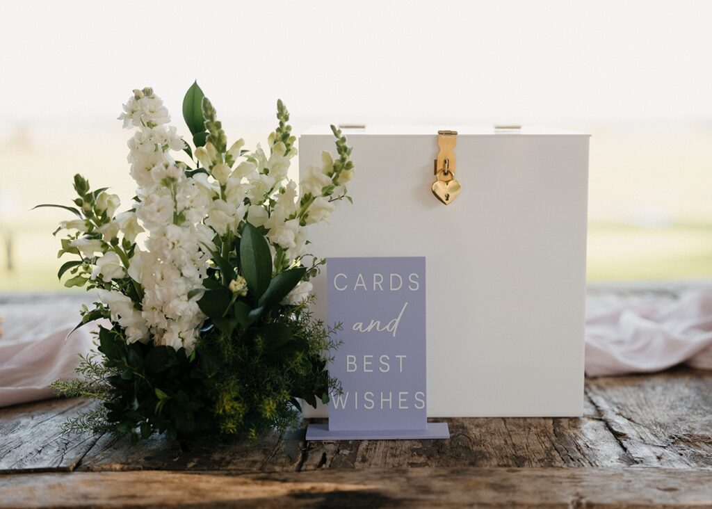 - Gift table white acrylic wishing well with gold heart lock, lilac and white sign, lilac table runner and flower arrangement.