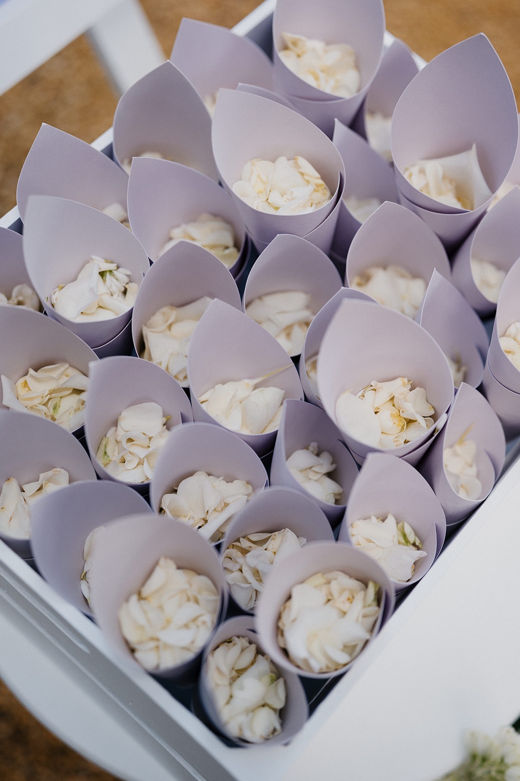 - Lilac paper cones filled with fresh white rose petals, styled in a white crate on a display table.