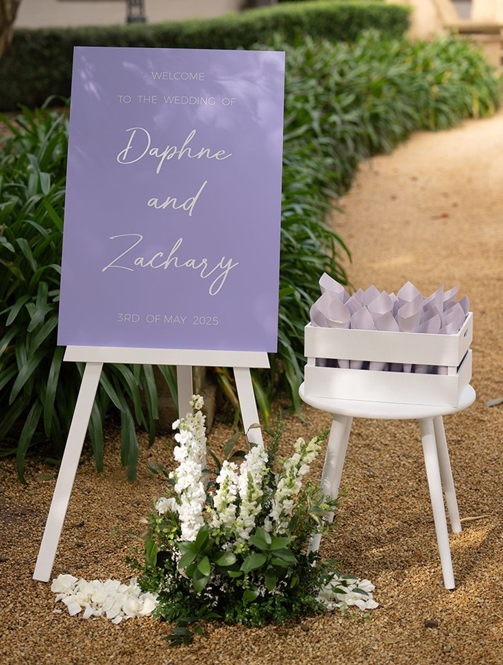 - Lilac and white welcome sign, styled on a white easel with a ground flower arrangement.