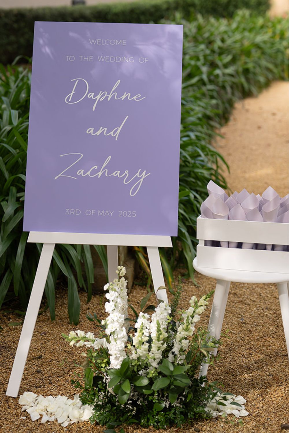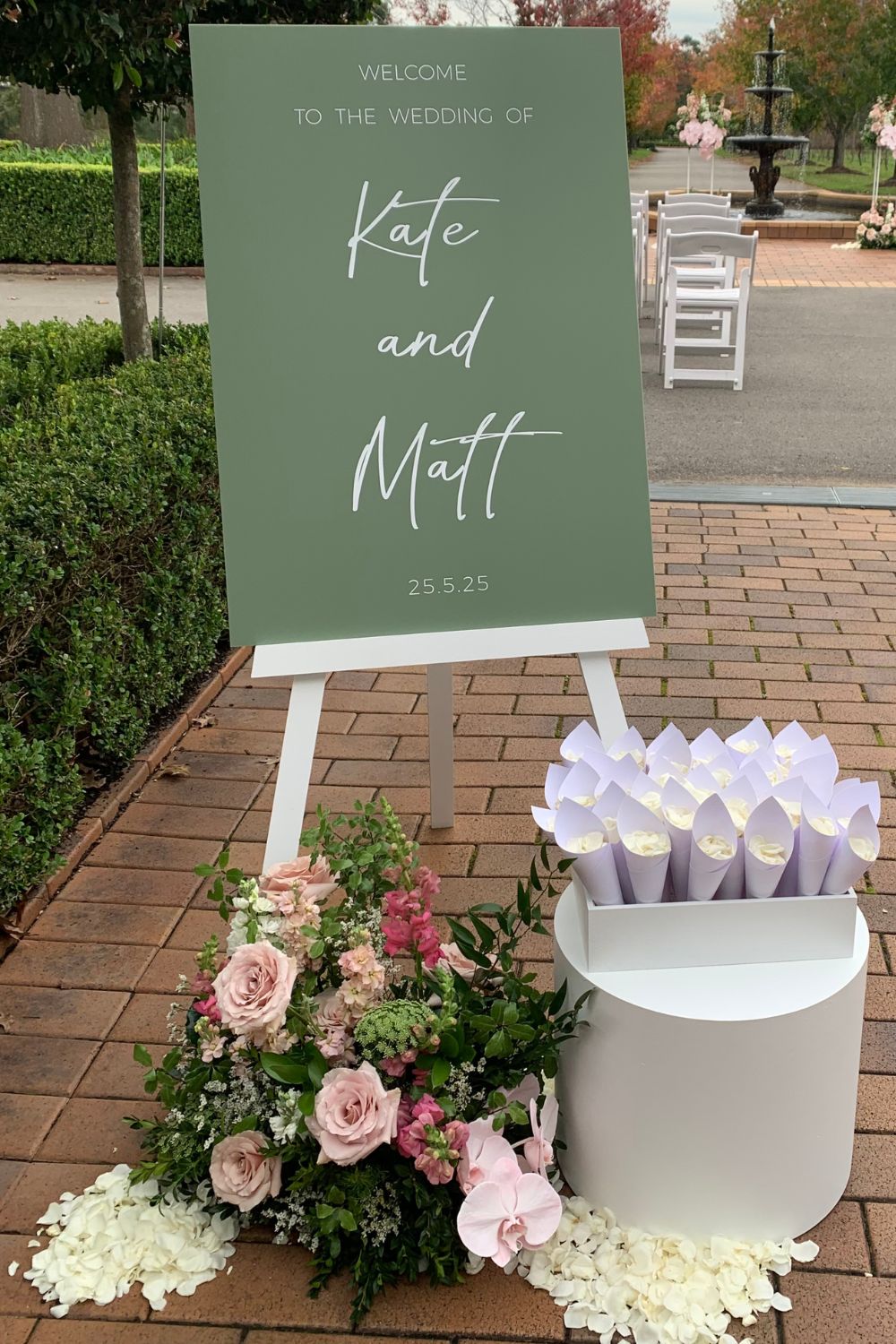 Signage can be made to corodinate with our styling decor hire, easels, hanging and freestanding stands, gift signs and table numbers.